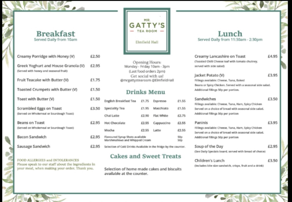 Welcome to Mr Gatty's Tea Room, nestled in the picturesque Elmfield Hall on Hyndburn Rd, Church, Accrington. This charming café offers a delightful retreat where the community can savor scrumptious meals and heartwarming drinks in a cozy and inviting atmosphere.